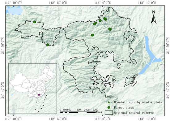 The study area is located in the Nanling National Nature Reserve in the north of Guangdong Province, China, in the middle of the Nanling Mountains. The area spans three counties (cities) of Shaoguan and Qingyuan city, namely Ruyuan, Yangshan and Lianzhou, with 24°37’ N–24°57’ N, 112°30’ E–113°04’ E, and covers an area of 58,400 ha. The highest peak in the area is Shikeng Kong, which is 1902 m above sea level and has a relative elevation difference of 1489 m. The vegetation types of the Nanling Mountains range from subtropical broad-leaved forest, mixed coniferous and broad-leaved forest, and mountain broad-leaved brushwood. The study area shows transitional monsoon climate between Central Asia and South Asia. The annual average temperature is 17.7 °C, with an extreme minimum temperature of −4.2 °C and the extreme maximum temperature of 34.4 °C, with the annual average frost-free period 276 days. The annual average precipitation is 1705 mm, with the annual average relative humidity 84%. Additionally, the precipitation is mostly concentrated from March to October, accounting for about 82% of the annual rainfall. The soils of reserve are mainly red soil, yellow soil and mountain scrubby-meadow soil.