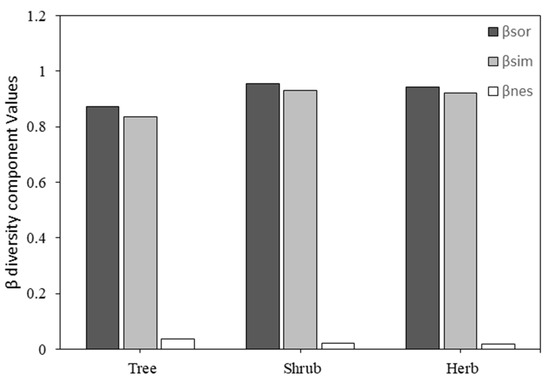 A total of 233 species belonging to 132 genera and 70 families were found in plots, including 200 species of trees, 46 species of shrubs, and 68 species of herbs. By calculating the β-diversity index of different plant forms, we found that the βSOR of trees, shrubs, and herbs were 0.87, 0.95 and 0.94, respectively. This indicated that plant species composition differed greatly among plots in the study area, and the species compositional dissimilarity of shrubs and herbs was higher. After decomposition of β-diversity into its components (i.e., species turnover and nestedness), the species turnover was predominant in the three plant forms, while the nestedness accounted for less than 10%. This implied that the species turnover component is more important in species composition in the Nanling Mountains (Figure 2).
