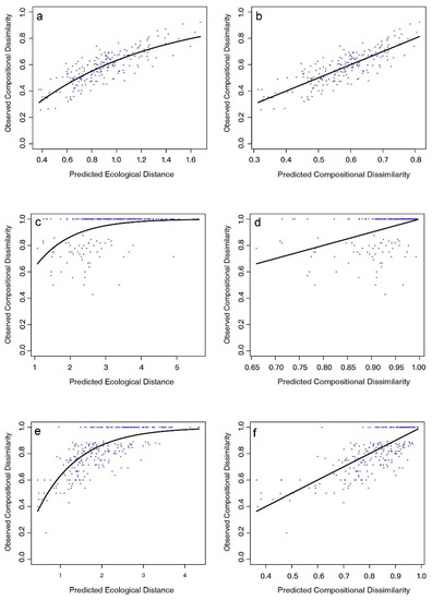 Relationships between compositional dissimilarity and geographical distance and relationships between predicted species compositional dissimilarity and the observed species compositional dissimilarity of different life form plants ((a,b) indicate trees, (c,d) indicate shrubs, (e,f) indicate herbs).