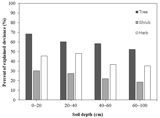 Soil chemical properties were the best explainers of tree β-diversity, with a mean explanation rate of 52.5%, followed by herbs (40.3%) and shrubs (21.8%) (Figure 4). With the increase in soil depth, the explanation rate of β-diversity of trees and herbs explained by soil chemical elements gradually decreased, since the explanation rate of chemical elements in the 0–20 cm soil layer remained consistently higher than the rates of deeper layers. Soil elements in the 60–100 cm layer showed the lowest explanatory power for β-diversity of trees, shrub and herbs.