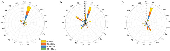 Sum of I-spline coefficients for environmental factors on β-diversity of trees (a), shrubs (b) and herbs (c). environmental factors included geographical distance (Dist), altitude (Alt), Boron (B), Molybdenum (Mo), Manganese (Mn), Zinc (Zn), Cuprum (Cu), Ferrum (Fe), Selenium (Se), Cadmium (Cd), Plumbum (Pb), Chromium (Cr), Nickel (Ni), Hydrargyrum (Hg) and Arsenic (As), Total nitrogen (TN), Total phosphorus (TP), Total kalium (TK) and Available nitrogen (AN), Available phosphorus (AP), Available kalium (AK).
