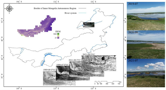 The study area in this work is located in the hinterland of Hulun Buir grassland, Inner Mongolia Autonomous Region, China, as shown in Figure 1. The geographic coordinates are 119°30′48″–120°35′36″ E 49°5′44″–19°27′15″ N, and average altitude 1480 m. The land cover types are mainly grassland, shrubland, and farmland. The area belongs to the mid-temperate continental steppe climate, which is located in the mid–high latitude temperate semi-arid region, with an annual precipitation of about 250–350 mm that is decreasing from east to west. The annual average temperature is about 0 °C, and the frost-free period is 85 to 155 days. The general characteristics of the annual climate are the following: cold and dry in winter and hot and rainy in summer. The annual temperature and the temperature date differences are large. Spring wheat, potatoes, and a small number of vegetables can be grown.