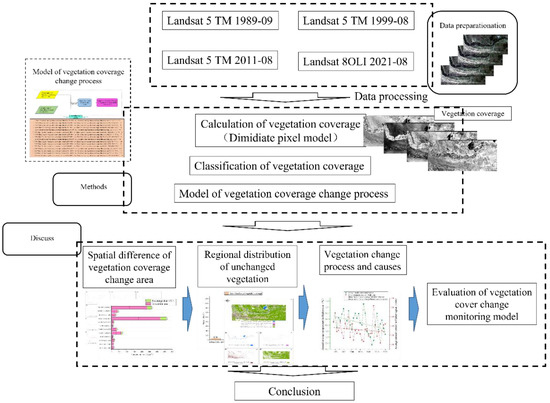 Figure 2 illustrates the technical flow of this work. First, the historical spatiotemporal vegetation coverage data from the four-phase Landsat images were identified, and the four-phase vegetation coverage data were classified to distinguish low, medium–low, medium–high, and high vegetation coverage areas. Then, the two periods of 1989 and 2021 were used to perform the vegetation coverage change monitoring model calculation (the operation procedure of the vegetation coverage change monitoring model is described in detail in Section 3.4), and the changing area was identified pixel by pixel between different categories. The differences in the temporal and spatial variation of the vegetation coverage in the study area were obtained. Finally, the advantages and disadvantages of the monitoring model of vegetation cover change, the spatial difference of vegetation cover change, the change process of the Hulunberg Sandy Land, and its driving factors were discussed, and the conclusions were drawn.