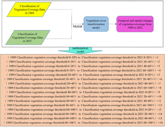 In our research, the classification method was used to compare the four time-varying scenarios of 1989, 1999, and 2011 based on the date of 2021 (the data obtained in this work started in 1989 since there were no images suitable for classification in the summer of 2000 and 2010; therefore, the images from the summer of 1999 and 2011 were chosen as representative). Dong et al., 2021, based on NDVI change data, proposed a vegetation change detection model for analysis and comparison of the NDVI change detection [9]. This technique easily provides a change matrix from which different transitions from vegetation cover intervals at one time to another can be visualized. After obtaining the classified images, this method can identify the changed regions as pixel-wise differences between different classes [9], which can clearly show the changed regions and the transformed classes. On this basis, we propose a monitoring model for vegetation cover change. Figure 3 shows the operation process of vegetation cover change monitoring model. The mathematical model and operation process of vegetation cover change monitoring are as follows: