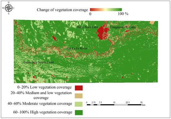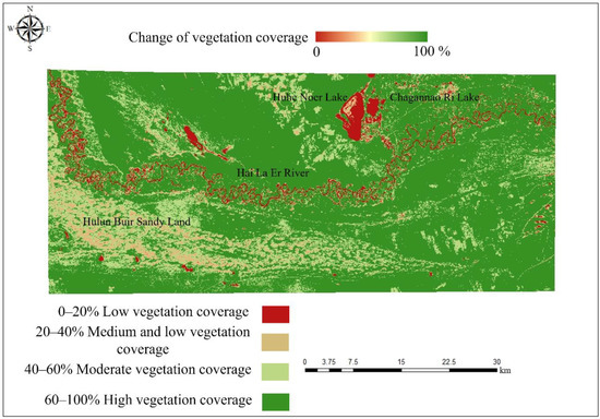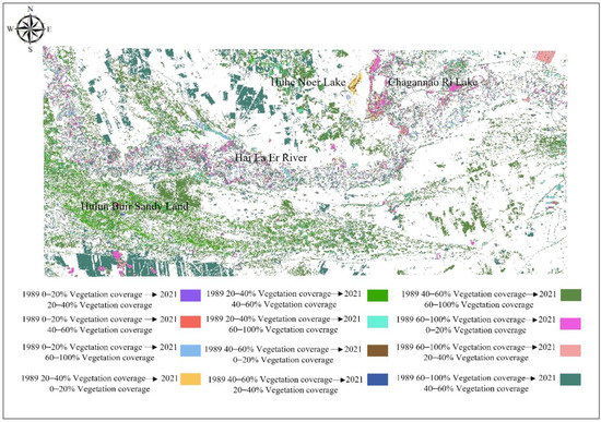 As can be observed from Figure 9, from the perspective of the spatial location of changes in the different types of vegetation coverage, the area with significant changes was located in the Hulun Buir Sandy Land, which indicates the change in the medium–high vegetation coverage in 1989 is the high vegetation coverage in 2021. At the same time, there are also areas with high vegetation coverage that have changed to medium and high vegetation coverage areas, whereas the change in location mainly occurs in the northern part of the study area. In the lower reaches of the Hai La Er River, a considerable part of the high vegetation coverage area was also degraded to the low vegetation coverage area. The areas where this change occurs are mainly located in the floodplain wetlands on both sides of the Hai La Er River.