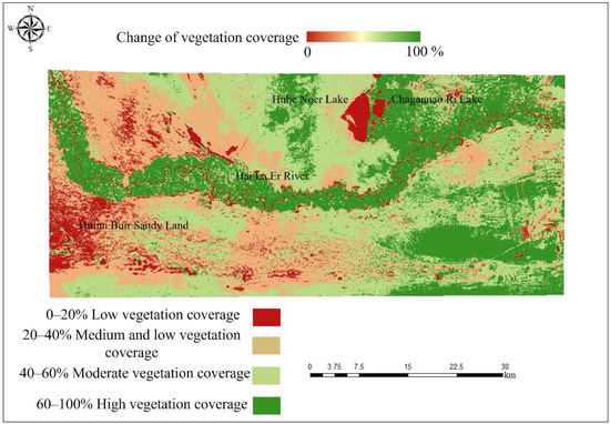The data obtained by the vegetation coverage change monitoring model show that there are spatial differences in the vegetation coverage change area. The total area of vegetation coverage changes was 758.95 km2, and the area from vegetation coverage above low to high vegetation coverage was 456.41 km2, accounting for 60.14% of the total change area. The area changed from high vegetation coverage to low vegetation coverage was 302.57 km2, accounting for 39.86% of the total change area. From 1989 to 2021, the vegetation coverage in the hinterland of the Hulunbuir grassland has generally improved.