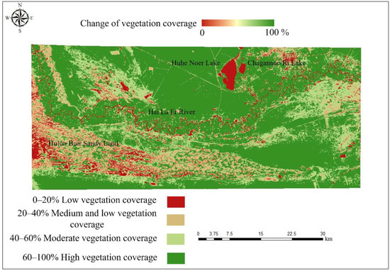 Due to the local policy orientation and the continuous improvement of ecological awareness, the vegetation growth environment has been improved, the expansion of the sandy land in Hulun Buir has been curbed, and the ecological environment in the region has been enhanced. As a result, the research area in the hinterland of the Hulun Buir grassland has a large area without vegetation coverage. The area without vegetation coverage was 1963.92 km2, accounting for 72.13% of the study area.