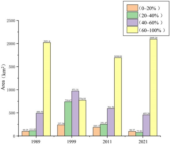 This work mapped the vegetation cover in the hinterland of the Hulunbuir grassland in 1989, 1999, 2011, and 2021 to analyze the changes in vegetation over the past three decades. Figure 4, Figure 5, Figure 6 and Figure 7 depict the classification of vegetation coverage in the Hulunbuir grassland hinterland during the period of vigorous summer vegetation growth at four time points in 1989, 1999, 2011, and 2021. Additionally, Figure 8 displays a column chart of the area of vegetation coverage in different classification intervals of the study area with km2 as the unit, while the total area of the study area was 2722.87 km2.