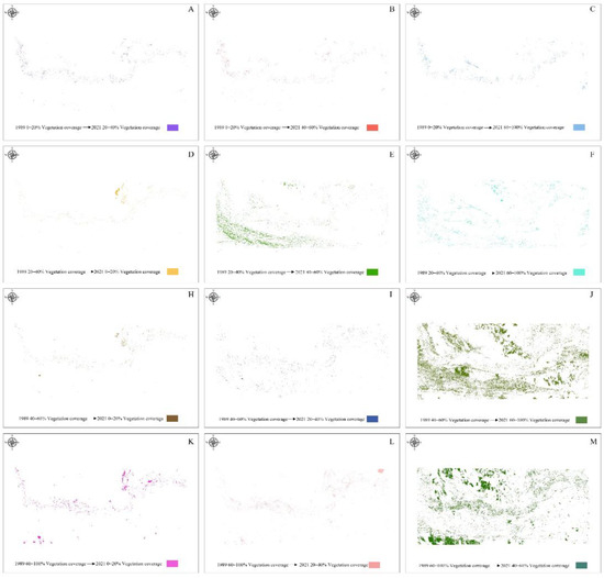 Changes in different vegetation coverage intervals in the past 30 years from 1989 to 2021 (A): the area of 1989 0–20% vegetation coverage change to 2021 20–40% vegetation coverage; (B): the area of 1989 0–20% vegetation coverage change to 2021 40–60% vegetation coverage; (C): the area of 1989 0–20% vegetation coverage change to 2021 60–100% vegetation coverage; (D): the area of 1989 20–40% vegetation coverage change to 2021 0–20% vegetation coverage; (E): the area of 1989 20–40% vegetation coverage change to 2021 40–60% vegetation coverage; (F): the area of 1989 20–40% vegetation coverage change to 2021 60–100% vegetation coverage; (H): the area of 1989 40–60% vegetation coverage change to 2021 0–20% vegetation coverage; (I): the area of 1989 40–60% vegetation coverage change to 2021 20–40% vegetation coverage; (J): the area of 1989 40–60% vegetation coverage change to 2021 60–100% vegetation coverage; (K): the area of 1989 60–100% vegetation coverage change to 2021 0–20% vegetation coverage; (L): the area of 1989 60–100% vegetation coverage change to 2021 20–40% vegetation coverage; (M): the area of 1989 60–100% vegetation coverage change to 2021 40–60% vegetation coverage).