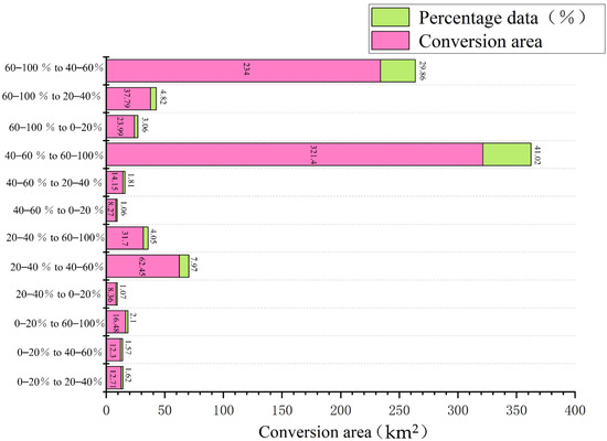 The vegetation coverage change monitoring model developed in this work is a good example of our long-term spatial and temporal sequence of vegetation changes. Figure 10 and Figure 11 show the changes in different vegetation coverage intervals in the past 30 years from 1989 to 2021. As can be seen, the areas with obvious vegetation coverage changes are Figure 10E,F,J,K,M. The change represented by E is that the 20%–40% medium and low vegetation coverage in 1989 changes to medium and high vegetation coverage in 2021. The main spatial area of transformation occurred in the Hulun Buir Sandy Land. The area of this transformation interval was 62.45 km2, which accounts for 7.97% of the total transformation area. The change represented by F is the change of 20%–40% medium and low vegetation cover in 1989 to high vegetation cover in 2021. The main transformation space area that occurs is located in the west of the study area, while the area of this transformation area is 31.37 km2, which accounts for 4.05% of the total transformation area. The change represented by J is the change from 40% to 60% medium to high vegetation cover in 1989 to high vegetation cover in 2021. The main transformation space area is located in the Hulun Buir Sandy Land study area. The area of this transformation area is 321.4 km2, which corresponds to 41.02% of the total transformation area. It is the main vegetation transformation area in the study area for the past 30 years. The change represented by K is the change of 60%–100% medium–high vegetation cover in 1989 to low vegetation cover in 2021. The main transformation space area is located in the floodplain wetland area around Hai La Er River, Huhe Nuoer Lake, and Chagannao Ri Lake. The area of this transformation area is 23.99 km2, which accounts for 3.06% of the total transformation area. The data results can be drawn from Figure 11. The total area of vegetation coverage changes in the study area was 758.95 km2. The area that changed from low or above vegetation coverage to high vegetation coverage was 456.41 km2, which accounts for 60.14% of the total change area. The area that changed from high vegetation coverage to low vegetation coverage was 302.57 km2, which corresponds to 39.86% of the total changed area.