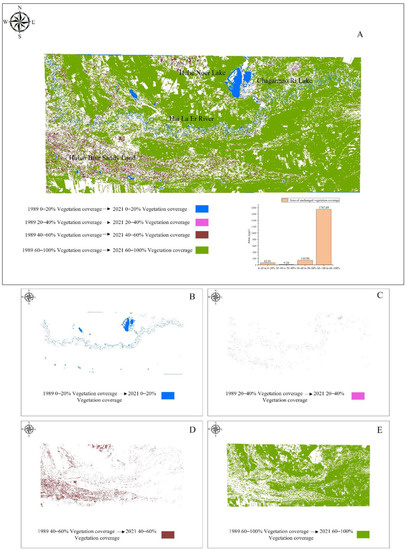 From a spatial point of view, the overall area of the study area without vegetation coverage in the hinterland of Hulun Buir grassland is relatively large. The total area of the study area is 2722.87 km2, and the area without vegetation coverage is 1963.92 km2, which accounts for 72.13% of the study area. Figure 12 depicts that the vegetation coverage in the study area has not changed. D and E show two areas with no significant changes. B represents the change from 0% to 20% low vegetation coverage in 1989 to the unchanged area in 2021. This part of the area is mainly the lower reaches of the Hailar River and the area within the area. As far as Huhe Noer Lake, Chagannao Ri Lake, and other water areas are concerned, the change represented by B is the area with no change from 0% to 20% low vegetation coverage from 1989 to 2021. This part of the area is mainly the lower reaches of the Hai La Er River and the water area of Huhe Nuoer Lake and Chagannao Ri Lake in the region. The change represented by D is the area with no change from 40% to 60% medium–high vegetation coverage from 1989 to 2021. This part of the area is mainly Hulun Buir Sandy Land, with an area of 144.94 km2. The change represented by E is the area with no change from 60% to 100% high vegetation coverage from 1989 to 2021. This part of the area is evenly distributed throughout the study area, and its area is 1747.69 km2.
