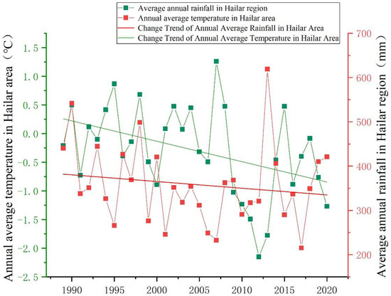 The impact of climate on vegetation changes is as follows: The ecological environment of the study area in the hinterland of Hulun Buir grassland is relatively complex and diverse, including grassland, swamp wetlands, floodplain meadows, shrubs, and other ecosystems. Figure 13 depicts the annual average data of temperature and rainfall in the Hai La Er region from 1989 to 2020, compiled in this work. The overall temperature and rainfall showed a downward trend. In addition, rainfall has a great impact on vegetation coverage. For example, in 1999, the average annual rainfall in the study area was 276.4 mm, and the average annual temperature was −0.49 °C, which was significantly lower than the climatic element data of the adjacent 1998 and 2000 years. Therefore, the vegetation coverage in 1999 showed a large area of low rainfall and low temperatures. The areas were covered by low to moderate levels of vegetation cover. The study area is located in the alpine region of Northeast China. With the decrease in the annual temperature, the permafrost of the soil increased, and the cold storage of the permafrost constituted a cooling control system, which led to an increase in the soil water content. At the same time, the temperature decreased and the vegetation and soil evapotranspiration decreased. These reasons generally play a role in promoting vegetation growth [46]. The Hulun Buir Sandy Land is due to the deforestation of the Pinus sylvestris forest from Hulun Lake to the western suburbs of Hai La Er when the former Soviet Union aided the construction of the railway, resulting in the desertification of the land. Historically, affected by human activities, vegetation has been severely damaged, resulting in land degradation. There are certain difficulties in the reconstruction. However, according to our monitoring data, the overall coverage of the Hulun Buir Sandy Land has been significantly improved, reflecting that the ecological quality of the area has improved. Our research results are also consistent with those of [44]. Vegetation cover change is driven by climate change and human activities, which change the concentration of vegetation cover.