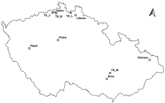 In this study, three natural T. baccata populations (Jílovské yews, TS_J; Březinské yews, TS_B, and yews from the Moravský Kras, TS_M) comprising a total of 125 individuals were used to compare their genetic diversity with the population in Lužické Mountains, which is concentrated in SO Mařeničky (TS_L). The yew population from the Protected Landscape Area Moravský Kras (Moravian Karst), TS_M, was included in the comparative analyses, as it is geographically quite distant, and according to the authors of [20], it should be genetically different from the three subpopulations from northern Bohemia. All of the populations are located in the Czech Republic (Table 1; Figure 2). In total, 165 individuals were subjected to microsatellite analysis. Where the number of yews at individual sites allowed it, a distance of at least 100 m was maintained between the donor individuals for the needle samples used for DNA analysis.