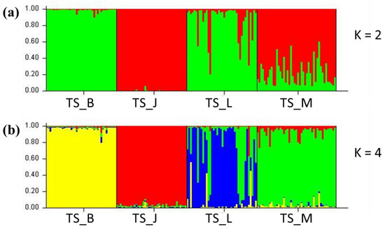 Analysis of the entire dataset using STRUCTURE and Structure Harvester suggested that K = 2 was the most relevant number of clusters (Figure 3). The K values were decreased from K = 2 to 10 in general but slightly increased at K = 4. According to the software documentation [30], K = 4 was also chosen because the four clusters exhibited strong assignments with the tested populations (Figure 4b). Different colours were used to indicate the proportion of cluster membership in each individual. At K = 2, the first cluster (red) had a significant proportion that was greater than the proportion determined in the TS_B and TS_L populations and smaller than the proportion determined the TS_M population. The second cluster (green) had a larger proportion in the TS_J and a smaller one in the TS_M (Figure 4a). At K = 4, all four subpopulations exhibited significant differences. The TS_B, TS_M, and TS_J populations remained as a fixed cluster, whereas the TS_L unit showed a smaller population genetic structure, with the number of individuals assigned to the cluster belonging to the TS_M population (Figure 4b).