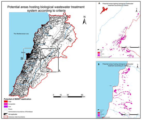 The final suitability map is shown in Figure 2 and Figure 3. It merges the highest, acceptable, and lowest potential areas hosting BWWT according to all the above-mentioned criteria in Lebanon (Figure 2). The high values on the maps indicate more suitable areas for BWWT plants. It is important to note that the spatial distribution of the suitable areas for BWWT sites differs for each of the criteria. The total area of these potential areas is 162.94 km2, distributed as follows:
