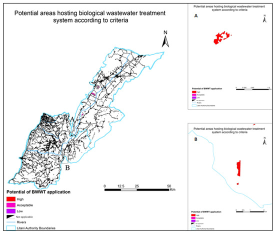 For this purpose, and to identify the most suitable locations for these plants, meticulous research on the factors determining the success of BWWT plants was employed, followed by a careful criteria gradation. Combining and filtering the resulting maps allowed the construction of a final map that differentiated areas into suitability classes: High, Acceptable, and Low, according to their potential to host BWWT. The high values on the maps are indicative of the more suitable areas for BWWT plants. It is important to note that there were important differences in the spatial distribution of the suitability classes among the different criteria. Overlapping the criteria revealed potential areas of around 162.94 km2 all over Lebanon, and 42.62 km2 in the Litani basin areas alone. This explains the importance of such a project covering around 1.55% of the country’s territory, with a span of more than 30 regions and the total number of beneficiaries reaching between 60,000 and 180,000 inhabitants, i.e., between 1.5% and 3.75% of the total population. The importance of the implementation of BWWT goes even further than ecology conservation and land reclamation reaching daily lives of farmers with the resulting purified water that is in great demand for irrigation.