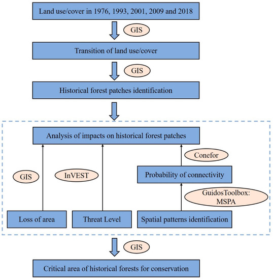 The methods this study used can be summarized as follows: (1) analysis of the transition of land use/cover; (2) identification of historical forest patches; (3) analysis of impact of land-use/cover change on historical forests; (4) determination of the critical areas for conservation (Figure 2).