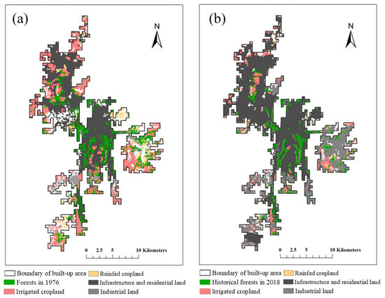 The transition matrix of the area between each land-use/cover type in the built-up area of Guiyang from 1978 to 2018 is shown in Table 2. Other transition matrices of four investigated periods can be found in the Supplementary Materials. The area of historical forests decreased from 4920.21 ha in 1976 to 2958.66 ha in 2018. The most severe loss of forests occurred in the eastern and southwestern regions of the built-up area (Figure 5). The forest patches located in the middle region were preserved and are still relatively intact.