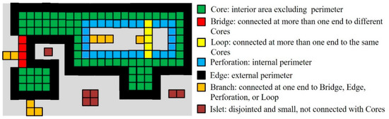 According to the land-use/cover data for 2018, we identified different spatial elements of historical forests using morphological spatial pattern analysis (MSPA) [43]. The MSPA was implemented by the GuidosToolbox available at http://forest.jrc.ec.europa.eu/ (accessed on 19 February 2021). The foundation of GuidosToolbox is mathematical morphology, and MSPA detects the morphometric feature classes of image objects as a function of their shape, connectivity, and spatial configuration [44]. The spatial patterns of historical forests were divided into seven classes at the pixel level by MSPA (Figure 4): core, bridge, edge, branch, islet, loop, and perforation [45]. Core is the interior area excluding internal and external perimeters. Bridge is the link connected at more than one end to different cores. Loop is the link connected at more than one end to the same core. Perforation and edge are the internal and external perimeter, respectively. Branch is the link connected at one end to bridge, edge, perforation, or loop. Islet is the disjointed and small patches, not connected with cores. The edge width was set to a value of 120 m (four pixels) because many studies recommended 100–200 m as the edge width to support edge-intolerant species [46,47,48].