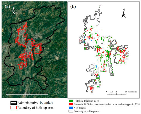 The locations of historical forests. (a) The administrative boundary (black line) and boundary of the built-up area (red line); (b) locations of historical forests that were retained, those that were transformed, and new forests.