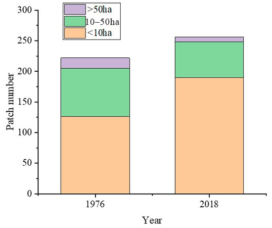 The number of historical forest patches increased to 256 from 222 during the 1976–2018 period. In particular, the increase in small patches (<10 ha) was approximately 51%, while the decreases in middle patches (10–50 ha) and large patches (>50 ha) were 21% and 53%, respectively, from 1976 to 2018 (Figure 6).