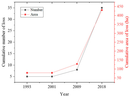 The cumulative numbers and areas of loss for forest patches that were fully transformed into other land-use/cover types.