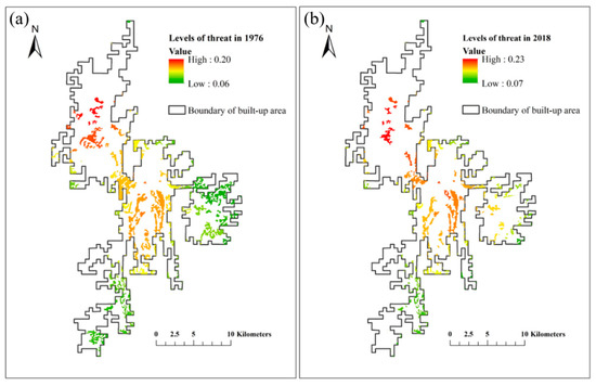 Levels of threat to historical forest patches in (a) 1976 and (b) 2018.