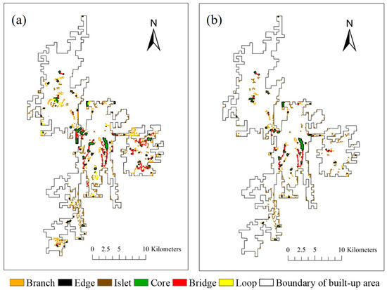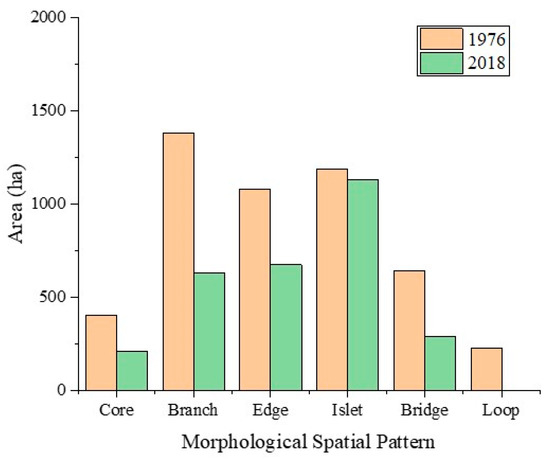 In the study area, the forest patches in 1976 were classified as follows: 106 cores, 33 bridges, 131 edges, 426 branches, 226 islets, and 13 loops (Figure 9a, Table 4). In 2018, the historical forests were composed of 62 cores, 21 bridges, 67 edges, 238 branches, and 275 islets (Figure 9b, Table 4). There were no perforations in the study area. Among the six morphological spatial pattern classes, the area of islets accounted for the majority of the total forest area (Figure 10). The proportion of islets was 24.1% and 38.5% in 1976 and 2018, respectively. Cores and bridges, which are two indispensable patterns, decreased considerably from 1976 to 2018. Compared to 1976, the area of cores decreased by 48%, while that of bridges decreased by 55%.