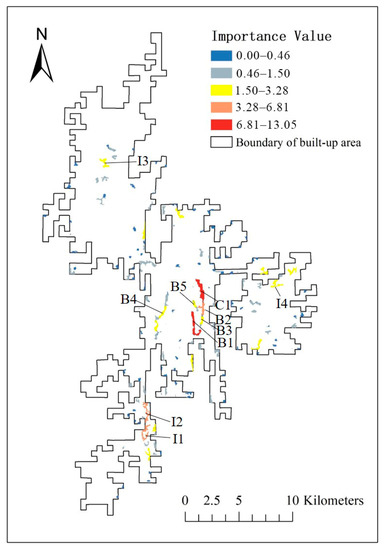 The dPC values (%) of cores, bridges, and some islets are presented in Figure 11. The top 10 most important elements of spatial patterns only included one core, which was located in the center of the city. Its dPC value was 13.5%, which is a very high value because, upon removing this core patch, the connectivity of the overall landscape would decrease by 13.5%. Five important bridges were all in the downtown area (2.23–11.87%). Four islets were far from the city center, but they also had relatively high dPC values (2.86–6.81%). Most cores, bridges, and islets next to the urban fringe had relatively low dPC values.