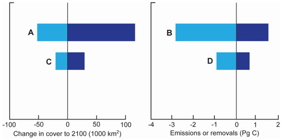 Impacts of sea-level rise on mangrove blue carbon stocks and fluxes. Estimates of changes in mangrove forest cover (A,C) under coastal adaptation scenarios that are either high (dark blue) or low (light blue). The projected influence on net blue carbon emissions and removals until 2100 (B,D) are estimated for RCP8.5 scenario (A,B) and RCP4.5 (C,D). Negative values are reductions in global cover or carbon emissions. Modified from source: [58]. Open access under the CC By-NC-ND license 4.0.