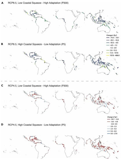 Potential changes in mangrove carbon stocks for two SLR scenarios, (A,B) RCP8.5 (high CO2 emissions) and (C,D) RCP4.5 (lower CO2 emissions) and for a low coastal squeeze–high adaptation scenario (A,C) and high coastal squeeze–low adaptation scenario (B,D). Warm colors indicate net losses and cool colors indicate net gains. Source: [58]. Open access under the CC By-NC-ND license 4.0.