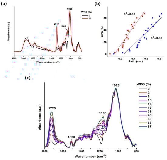 For ester carbonyl (ca. 1725 cm−1), the correlation between WPG and both BAR and BHR was high and equal to 0.93 and 0.88, respectively (Figure 3b), whereas for C-O-C vibrations in esters (absorption at ca. 1163 cm−1), the correlation was significantly lower (0.20 for BAR and 0.59 for BHR); hence, it is not presented here.