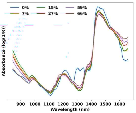 Near-infrared measurements are highly sensitive to the moisture content (MC) of the test material []. Thus, all samples (50 × 50 × 50 mm3) were oven-dried (103 °C, 24 h) before the measurement and kept in a desiccator over silica gel. NIR spectra were recorded using a PSS 1720 spectrometer (Polytec GmbH, Waldbronn, Germany). From each measurement point (19 mm diameter, including both early- and latewood in the radial plane), 10 scans were collected at a spectral resolution of 8 cm−1 in a diffuse reflection mode, i.e., light penetrated the sample, scattered within it and returned to the surface, where the absorption was calculated based on a diffused reflection. The scans were averaged and saved as the absorbance log(1/R) in the laboratory software PSS-S-AXC 1.7 (Polytec GmbH, Waldbronn, Germany). The spectral range used for the measurements was 850–1650 nm, which was the maximum wavelength range allowed by the spectrometer.