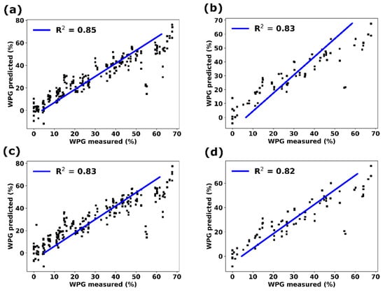 The model performance was evaluated by the coefficient of determination (R2) and root-mean-square error (RMSE) of both the cross-validation (RMSE-CV) and test set (RMSE-TS). In general, developing a model based on the entire tested wavelength range (844–1656 nm), independently of the tested plane or pre-processing method used, resulted in the highest predictive power, i.e., the highest R2 and the lowest RMSE for both CV and TS. This would indicate that the entire tested wavelength range carries meaningful information for the WPG prediction. Therefore, based on the wavelength range 844–1656 nm, two models have been selected as the most robust ones: one with no pre-treatment prior to model building (R2 of 83%) and the other after the second derivative has been applied (R2 of 82%), as can be seen in Figure 5. It is surprising that even with no pre-treatment, it was possible to obtain a high prediction of the WPG. Moreover, as expected, prediction is poorly suited to close the boundary values, which is a common phenomenon.