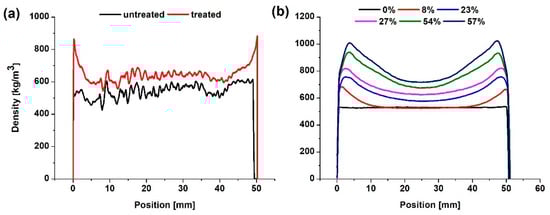 Preliminary tests were conducted to identify the homogeneity of the SorCA distribution in the radial direction of the samples. It became evident that for every treatment, the specimens showed a higher amount of chemicals nearer to the surfaces of the specimens than in the middle. To verify this observation, one randomly selected specimen of every treatment was turned 90° and the density profile was measured in the longitudinal direction.