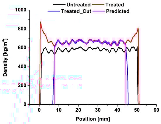 To enable the prediction of a density profile after the treatment based on the profile of the same specimen before the impregnation, the edges with high concentrations of SorCA had to be cut. Otherwise, these regions of high density led to wrong assumptions for the model development. The initial goal was to assign each WPG value to the difference between the untreated and treated density profile areas. Therefore, as part of the QC process, pieces from different parts of the wood boards would be measured before and after the treatment to assign the WPG values to the respective sections of the boards. A simple illustration of this idea can be found in Figure 7, which shows a density profile of a specimen with 16% WPG. The specimen was first measured before the treatment and then after curing, when it turned out that the edges had to be cut. Then, another density measurement was taken after cutting both high-density edges. Based on the estimated density profile of the cut specimens before the modification, the density profile of a treated sample has been predicted and compared with the actual measurement from the calibration set. Since the density profile of a reference sample measured in a laboratory and the predicted density profile of the same sample are almost identical, this method shows a huge potential for QC purposes. However, for now, the main challenge is to prepare a calibration set of uniformly modified wood specimens that do not require further cutting.