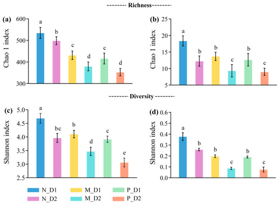 Richness and diversity of the bacteria, (a,c), and archaea, (b,d), at the genera-level. N: Natural broadleaved forest, M: Mixed-species plantation, P: Chinese fir (Cunninghamia lanceolate (Lamb.) Hook.) plantation; D1: 0–20 cm, D2: 20–50 cm. Error bars represent the standard deviation (SD, n = 9). The lowercase letters denote the significant difference (P < 0.05) based on the Tukey test.
