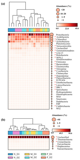 Variations in the relative abundance of bacteria (a) and archaea (b) at the phylum level. N: Natural broadleaved forest, M: Mixed-species plantation, P: Chinese fir (Cunninghamia lanceolata) plantation; D1: 0–20 cm, D2: 20–50 cm. The asterisk (*) represents a significant difference by post hoc Tukey–Kramer test (P < 0.05 after Benjamini–Hochberg correction).