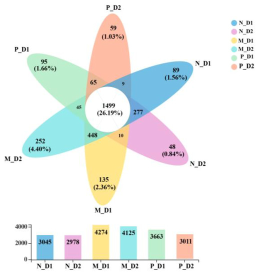 Venn diagram of the number of shared and unique operational taxonomic units (OTUs). Overlapping parts represent the shared OTUs, non-overlapping parts represent the specific OTUs of the groups, and the number indicates the corresponding number of OTUs. The corresponding numbers in the bar are the number of OTUs to different groups. N: Natural broadleaved forest, M: Mixed-species plantation, P: Chinese fir (Cunninghamia lanceolata) plantation; D1: 0–20 cm, D2: 20–50 cm.