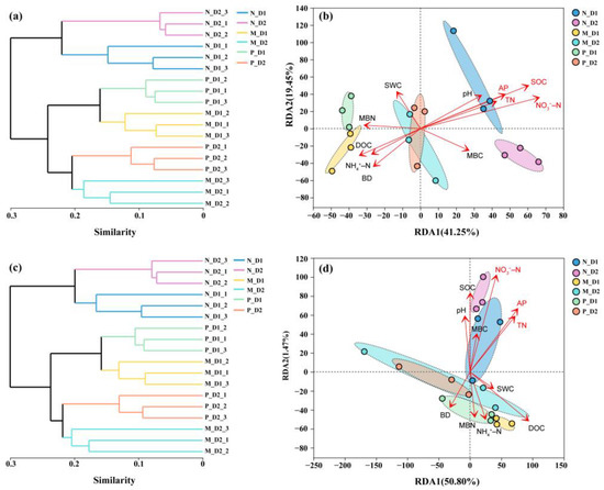 Clustering analysis for soil bacterial (a) and archaeal (c) communities based on the Bray–Curtis dissimilarity at the OTU level. Redundancy analysis (RDA) of the relationship between bacterial (b) and archaeal (d) communities and soil physicochemical properties. Arrow’s length indicates correlated degree of soil physicochemical properties and bacterial and archaeal communities. The significant correlations are marked with red font (P < 0.05). Color ellipse indicates significant clusters based on permutation analysis (P < 0.05). N: Natural broadleaved forest, M: Mixed-species plantation, P: Chinese fir (Cunninghamia lanceolata) plantation; D1: 0–20 cm, D2: 20–50 cm. BD: bulk density; SWC: soil water content; NO3−–N: nitrate nitrogen; NH4+–N: ammonium nitrogen; TN: total nitrogen; SOC: soil organic carbon; DOC: dissolved organic carbon; MBC: microbial biomass carbon; MBN: microbial biomass nitrogen; AP: available phosphorus.