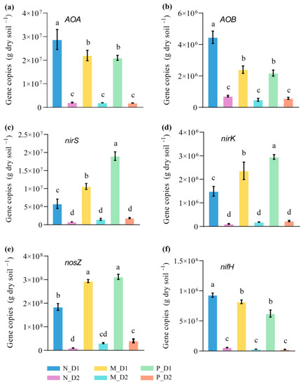 Abundance of functional genes of amoA of archaea (ammonia-oxidizing archaea, AOA) (a), amoA of bacteria (ammonia-oxidizing bacteria, AOB) (b), nirS (c), nirK (d), nosZ (e), and nifH (f) from the soil samples. N: Natural broadleaved forest, M: Mixed-species plantation, P: Chinese fir (Cunninghamia lanceolata) plantation; D1: 0–20 cm, D2: 20–50 cm. Error bars represent the standard deviation (SD, n = 9). Lowercase letters indicate significant differences between groups based on the Tukey test (P < 0.05).