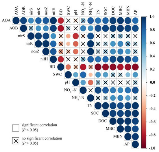 Correlations between soil physicochemical properties and the abundance of functional communities related to the nitrogen cycle. The variables include soil bulk density (BD), soil water content (SWC), nitrate nitrogen (NO3−–N), ammonium nitrogen (NH4+–N), total nitrogen (TN), soil organic carbon (SOC), dissolved organic carbon (DOC), microbial biomass carbon (MBC), microbial biomass nitrogen (MBN), and available phosphorus (AP). The functional communities include ammonia-oxidizing archaea (AOA), ammonia-oxidizing bacteria (AOB), denitrifiers (nirS, nirK, and nosZ), and nitrogen fixers (nifH). The colors show the Pearson’s correlation coefficients and indicate a positive or negative correlation. The size of circles signifies the strength of the correlation. Non-significant correlations (P > 0.05) are marked.