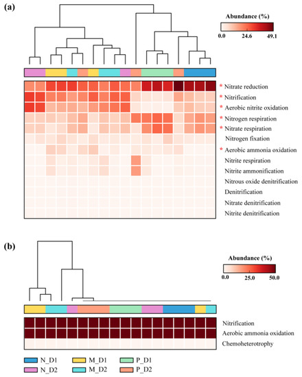 Variations in the relative abundance of the nitrogen functional bacteria (a) and archaea (b) identified by Functional Annotation of the Prokaryotic Taxa (FAPROTAX) database. N: Natural broadleaved forest, M: Mixed-species plantation, P: Chinese fir (Cunninghamia lanceolata) plantation; D1: 0–20 cm, D2: 20–50 cm. The asterisk (*) represents a significant difference determined by a post hoc Tukey–Kramer test (P < 0.05 after Benjamini–Hochberg correction).
