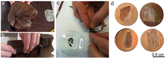 Preparation of thin slices of waterlogged archaeological wood (WAW) for SEM analysis. (a) Thin sections of wood were cut by hand from the frozen WAW disk using a razor blade (b,c) and were flattened on specimen mounts pre-treated with albumin (d).