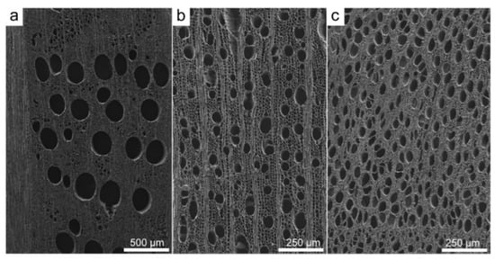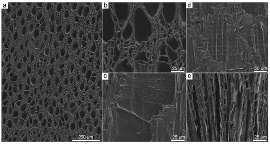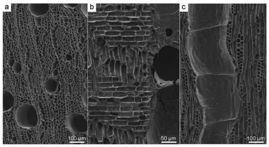 SEM simultaneously allows viewing larger portions of the wood at lower magnifications or obtaining high resolution images of the three-dimensional wood microstructure. Under magnifications much larger than those of LM, SEM can better detect cell wall thinning caused by the loss of cell wall components [32,33], although much expertise is required to detect such changes because SEM does not allow staining (like LM) or contrasting (like TEM) of cell wall components. Thus, a combination of LM, SEM and other microscopy techniques is often used to provide complementary information from morphological to microstructural and chemical levels [29,31].