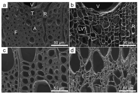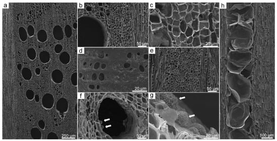 The observation under SEM at high magnifications showed the 3D structure and state of preservation of the cell walls, which varied with the species (Figure 3, Figure 4, Figure 5, Figure 6, Figure 7 and Figure 8). The heartwood of Quercus sp. appeared to retain the structural features, although it was not possible to distinguish different cell types of similar size but usually different cell wall thickness, such as fibres, vascular tracheids and axial parenchyma, in cross-sections. These cells could not be differentiated as they all had very thin cell walls (Figure 3b). The WAW of Populus sp. generally appeared to be the most degraded of all species (Figure 3 and Figure 7), and its wood appeared collapsed when observed under SEM (Figure 3d).