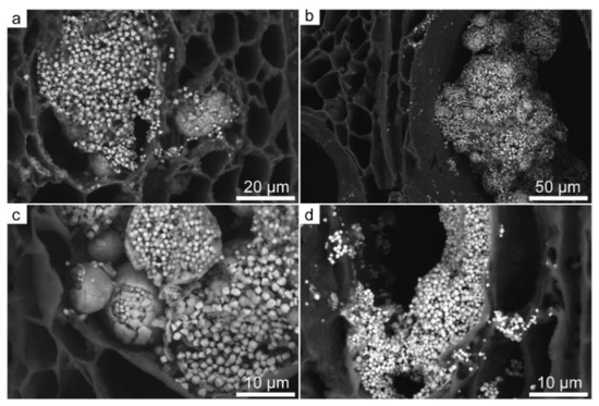 Observations at 5 kV in low vacuum with LFD proved to be optimal to observe the wood features [48], while inorganic inclusions could not be identified at this voltage and with this detector. Using 15 kV with a CBS detector in our study allowed observation at greater magnifications and detection of various inorganic inclusions. The best conditions to observe the inorganic inclusions were obtained at 15 kV with a CBS detector, which made it possible to obtain the chemical contrast (difference in composition, atomic number) (Figure 4g).