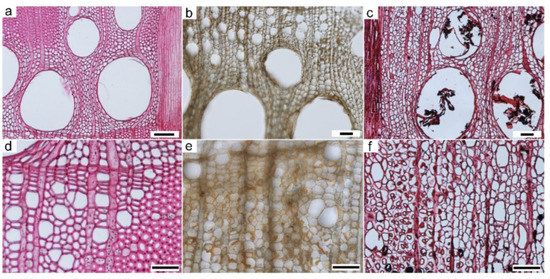Light microscopy of Quercus sp. cross-sections at low (a–c) and high (d–f) magnifications. Recent wood (a,d); hand cut sections from frozen WAW, thickness >20 µm (d,e) and samples embedded in paraffin and cut with a rotary microtome, thickness 9 µm (c,f). Scale bar = 100 µm (a), 50 µm (b–f).