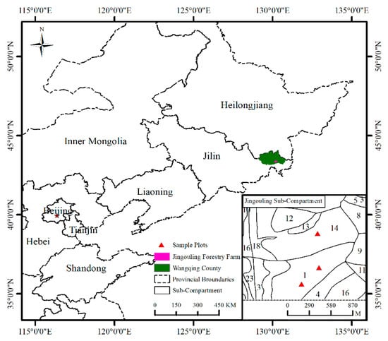 Location of study area: Wangqing Forest Bureau in northeast China and spatial distribution of 3 sample plots (bottom).