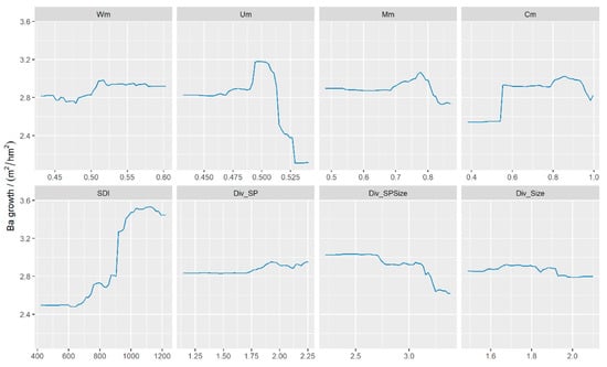 For whole stand (Figure 2), Um was the most-important predictor of the stand spatial structure. BAI first increased and surpassed a maximum and then decreased as Um increased. BAI increased with the increase in Mm and surpassed a maximum and then decreased. BAI increased slowly with the increase in Wm and then became constant at a maximum value of 0.517. However, BAI increased sharply when Cm took a value between 0.5 and 0.6. When it came to Div_SPSize, there was a clear trend of decreasing at the late of the curve. In contrast, Div_Size had little discernible influence on BAI. When Div_SP was between 1.75 to 2.25, BAI increased gradually with a slight fluctuation.